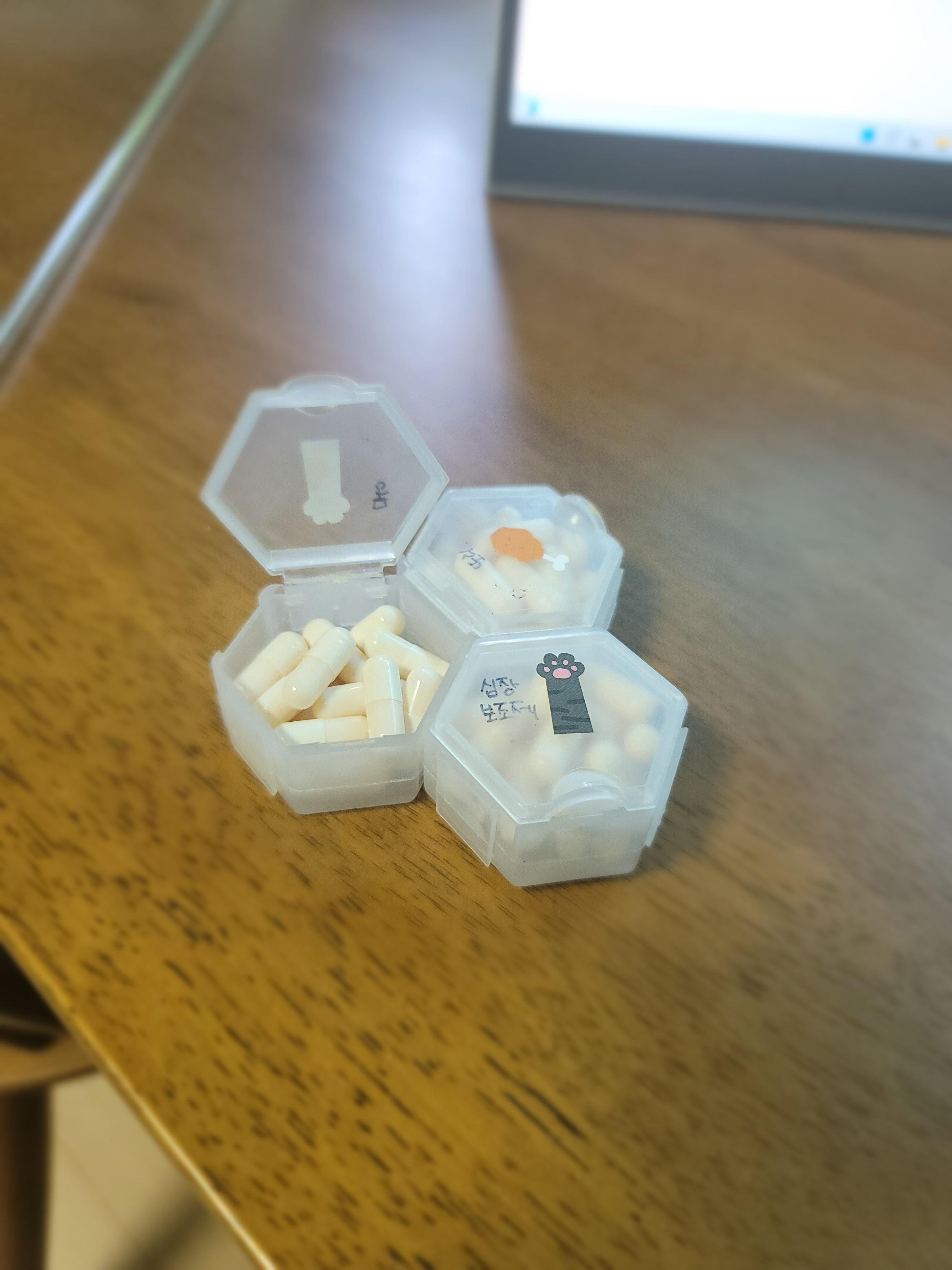 위의 체크사항을 꼭 확인하면서 하루에 두 번 심장약을 먹이라고 하셨습니다. 약은 가루약으로 받아 저희가 캡슐로 옮겼습니다. 가루로 받아 습식이나 츄르에 타서 주면 좋겠지만, 저희 몽이는 습식을 안먹고 츄로도 잘 먹지 않는 입이 짧은 아이입니다. 그래서 캡슐에 넣어 필건으로 먹이고 있습니다.