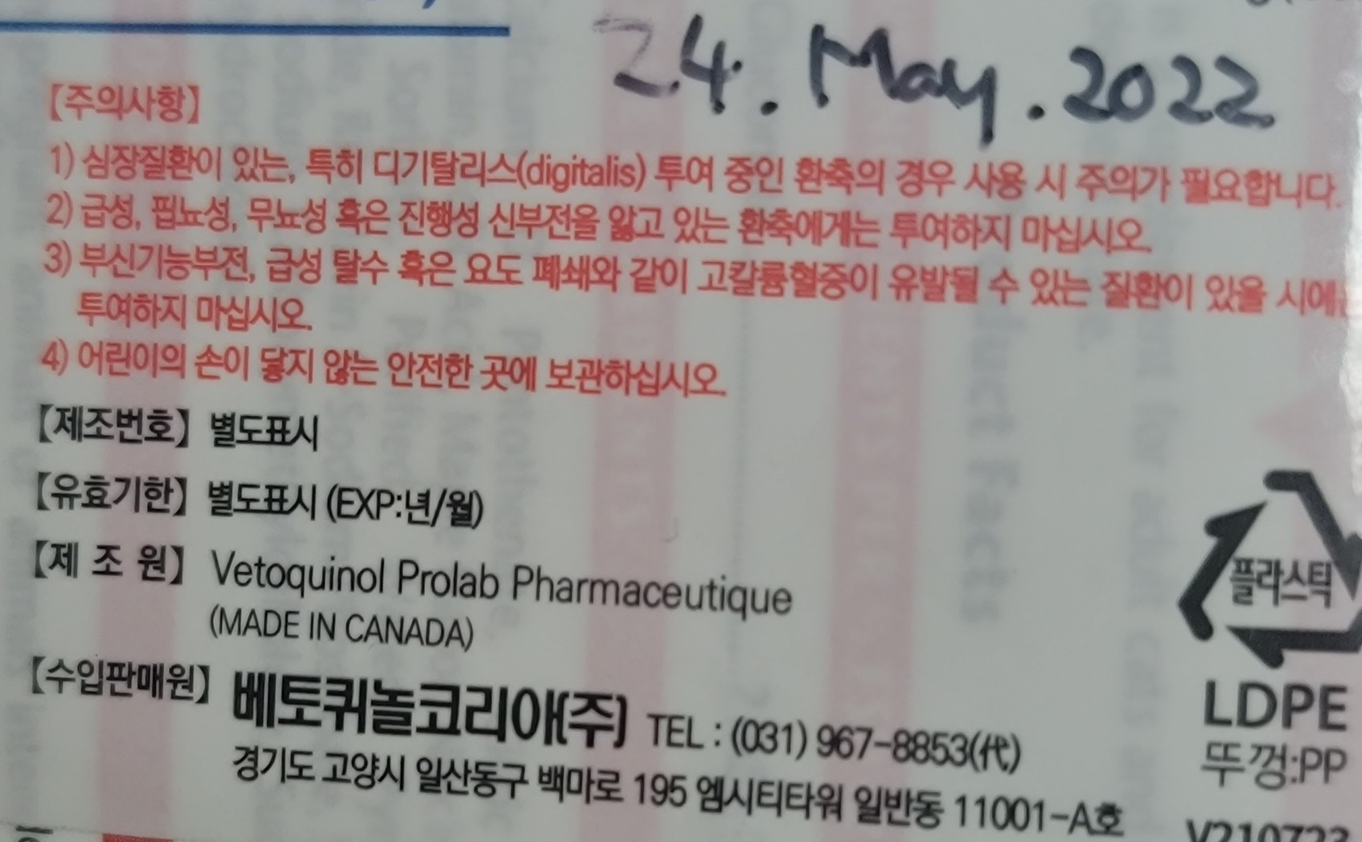 디기탈리스 투여 중이거나 급성, 핍뇨성, 무뇨성 혹은 진행성 신부전 등등 아이에게는 투여 금지 안내문입니다.