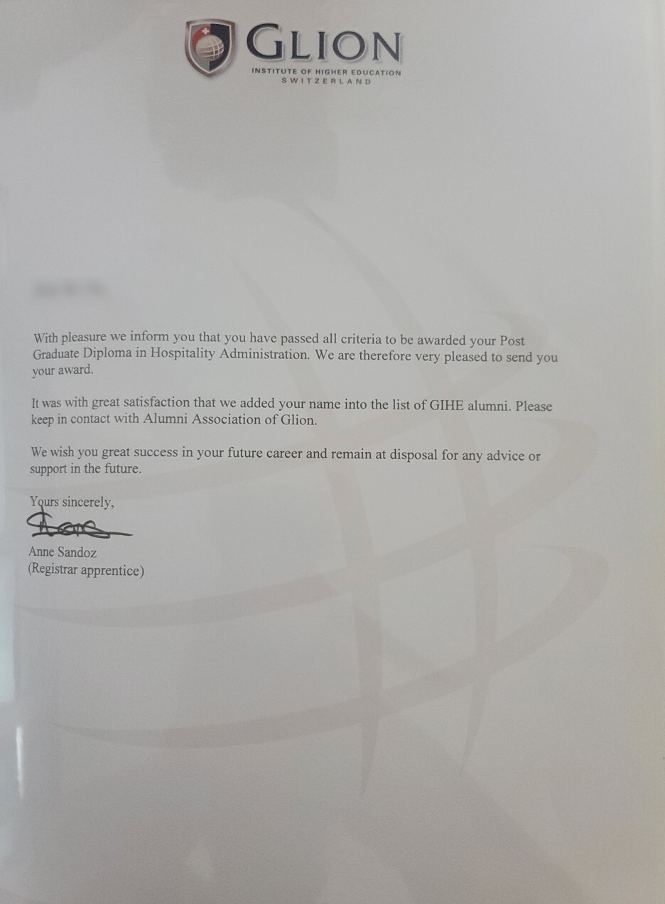 이 후, 나는 스위스 호텔 학교를 찾아보게 되었고, G.I.H.E 호텔학교 Glion Institute of Higer Education에 PGD 학생으로 입학하게 된다. PGD는 Post Graduate Diploma 과정으로 유럽에서 학교를 나오지 않았으나, 타국에서 4년제 대학을 졸업한 사람들에게 자격증을 주는 과정으로 수료증(Certificated)받는 과정과 자격증(Diploma)을 받는 과정이 나뉘어져 있으며, 더 나아가 Higer of Diploma 과정도 있다.