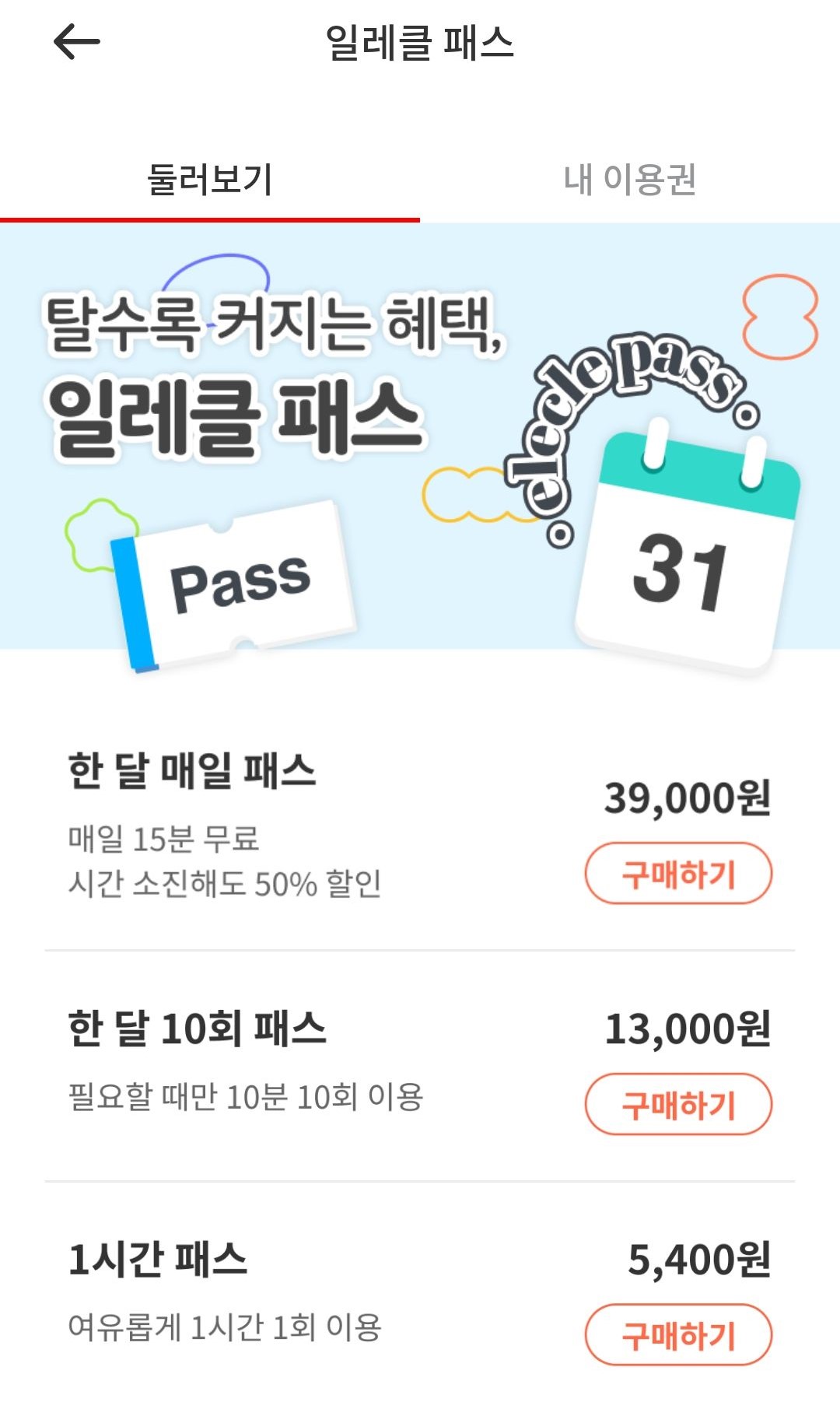 네번째, 일레클 패스라는 정액제도 있으니 확인 (공유 킥보드에는 없는 옵션)