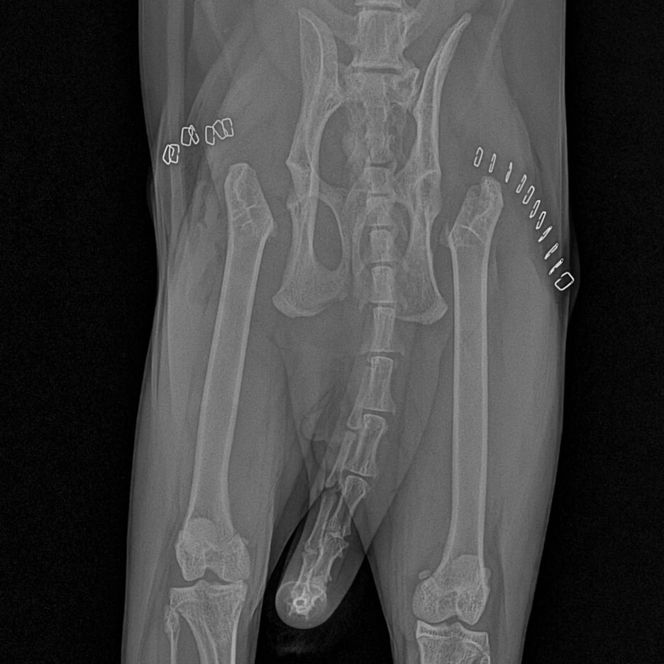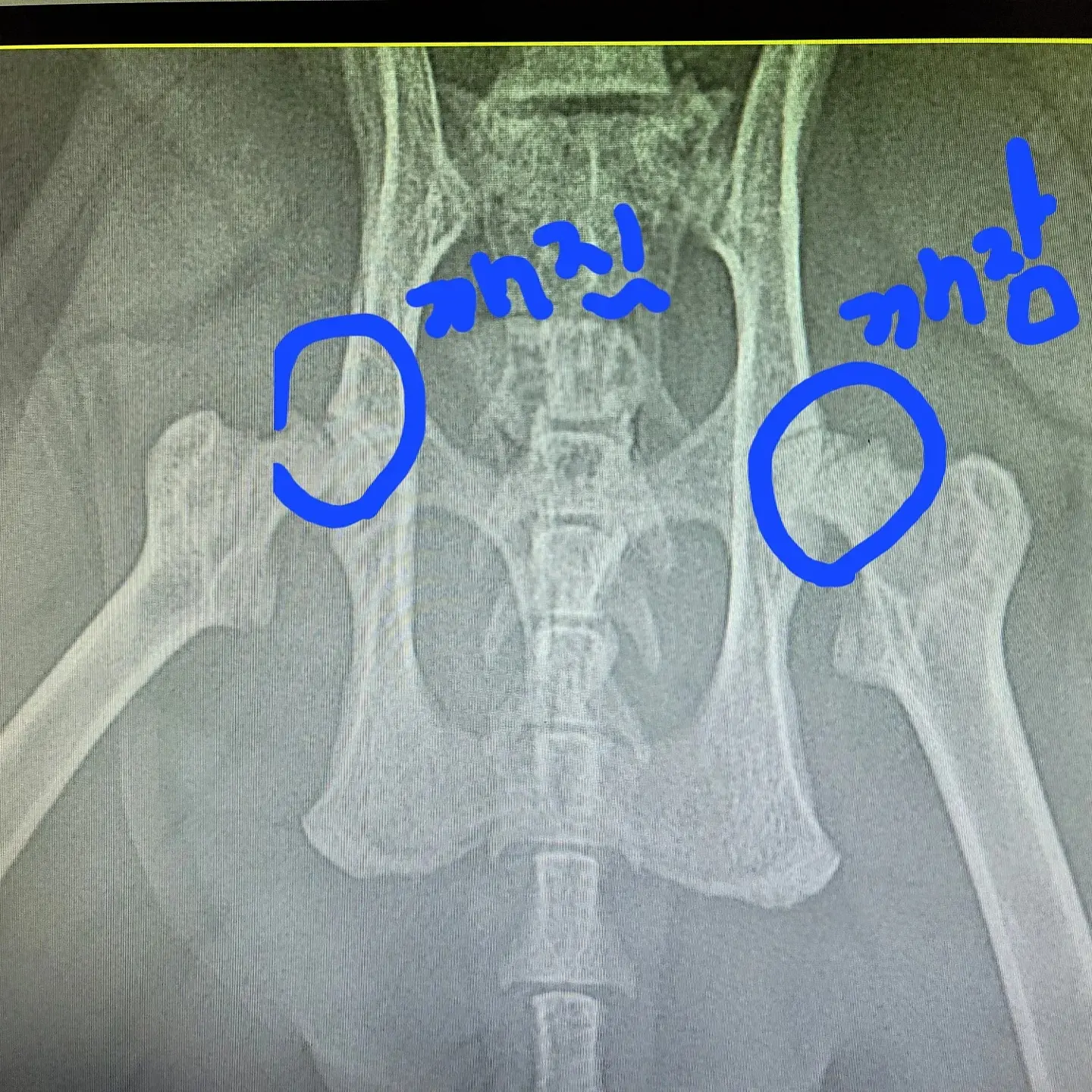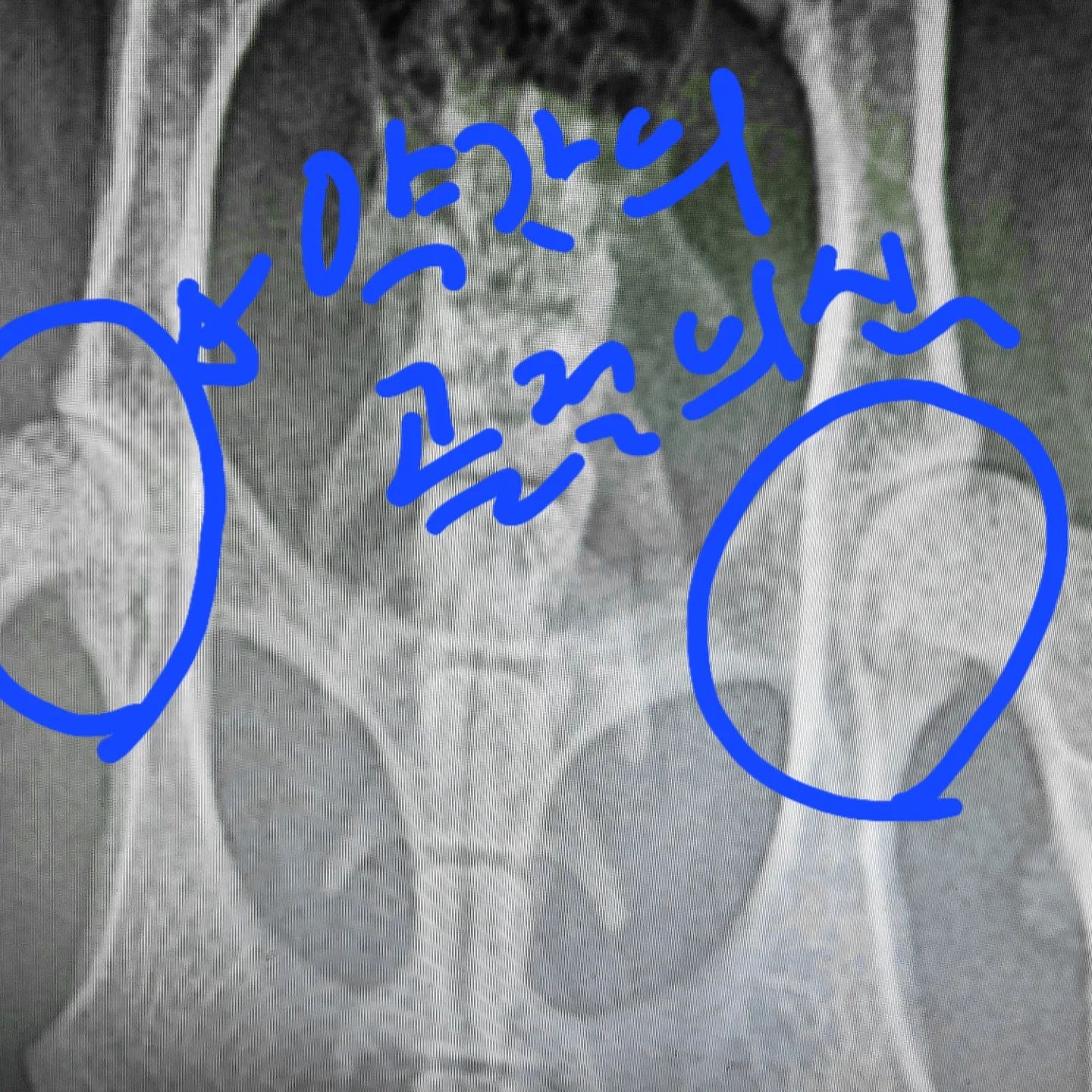 엑스레이를 무려 4번을 찍고 나서야 또리 뒷 다리 골두가 깨졌음을 확인이 가능했습니다. ㅜ.ㅜ