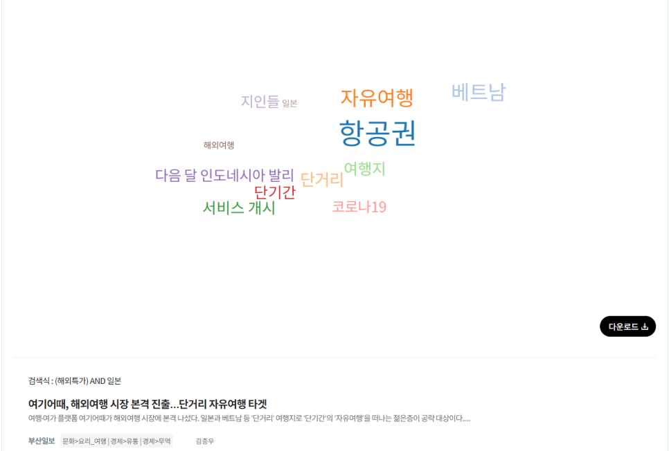 그래서 워드클라우드로 54개 뉴스저널의 1개월치 분량에서 '여기어때'로 검색을 해 보았습니다. 글씨가 크고 파란색 계열로 갈수록 키워드 빈도수와 가중치가 높은 것을 나타냅니다. 아직까지는 야놀자라는 OTA업계 1위 그늘에 가려져 있는 것이 보이며, 예전 개인정보 유출에 관련된 글이 아직은 '여기어때' 업체의 꼬리표로 따라다니는 것을 볼 수 있습니다. 그래서 해외특가라는 단어만 두고 1개월 기간으로 검색해 보았습니다.